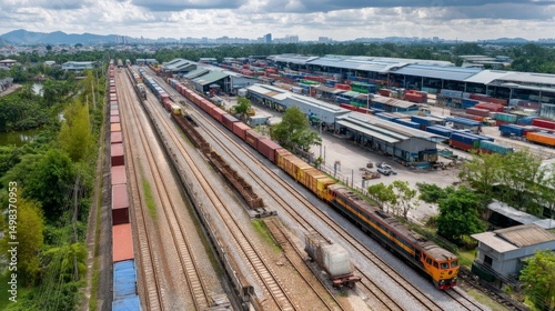 Train movement overhead shot railway yard aerial photography urban landscape dynamic perspective industrial concept