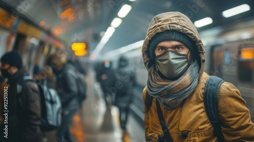 Train station scene Depict commuters wearing masks while waiting on platforms or boarding trains at a busy train station, showcasing