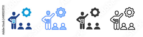 training, workshop, practice, session, presentation, conference, management, cognition, course, explaining, icon, outline, line, lineal, illustration, glyphs, black, blue, blueprint
