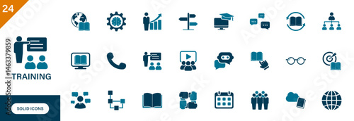 Training icons. Containing learning, knowledge, education, orientation, learning goals. Solid vector icon set.