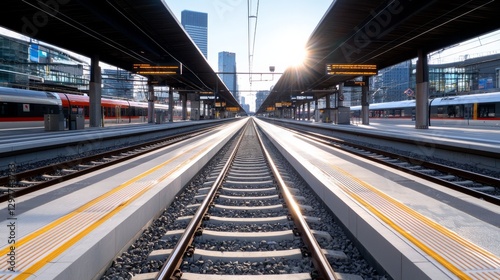 railway, station, train, sunrise, track, city, urban, travel, commuting, architecture, skyline, transportation, morning, view, infrastructure, platform, city landscape, passenger, rail, journey, movement, public transport, modern, bright light, tied-up, metropolitan, city life, sun ray, commuter