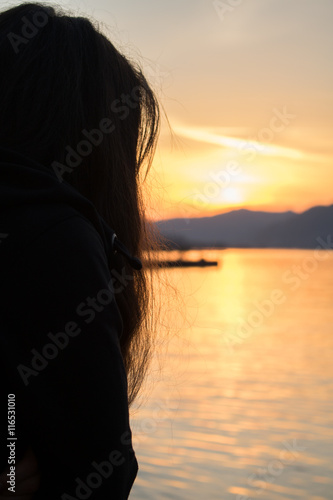 sunset, lake, sun, heaven, shadow, silhouette, woman, girl, mountain, golden hour, golden hour