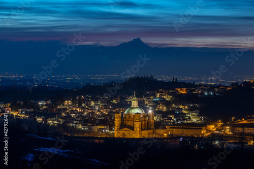 tramonto sul santuario di vicoforte e monviso sullo sfondo