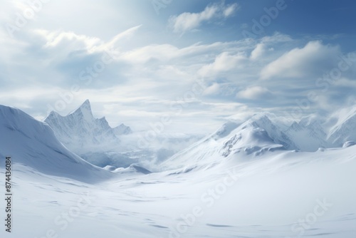 Tranquil and serene snow-capped mountains with a pristine landscape and a vast. Untouched natural beauty under a clear blue sky with wispy clouds
