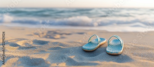 Tranquil Beach Scene: Flip-Flops on Golden Sand with Ocean Waves