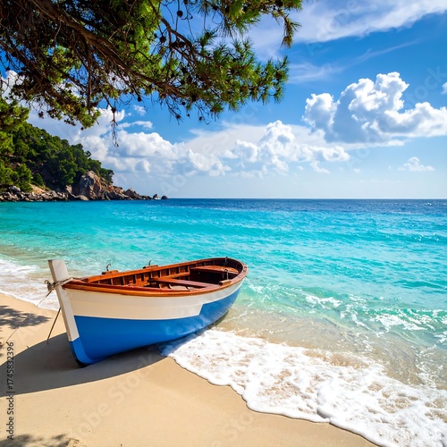 Tranquil beach scene with a small wooden boat. Sunny turquoise water laps gently onto a sandy shore, shaded by pine trees