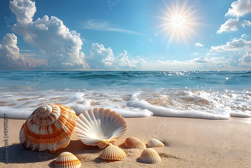 Tranquil Beach Scene with Seashells Under Bright Sunlight - Ideal for Summer Vacation Prints and Designs