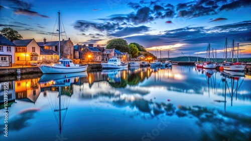 Tranquil Blue Hour Reflections Over Calm Water in a Serene Harbour at Dusk with Soft Light