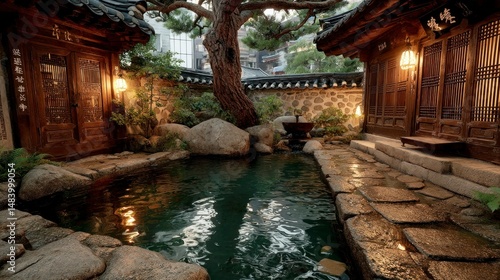 Tranquil Courtyard with Traditional Architecture and Serene Pond