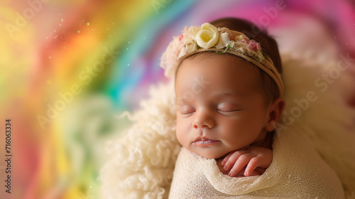 Tranquil double exposure portrait of newborn baby blended with soft rainbow