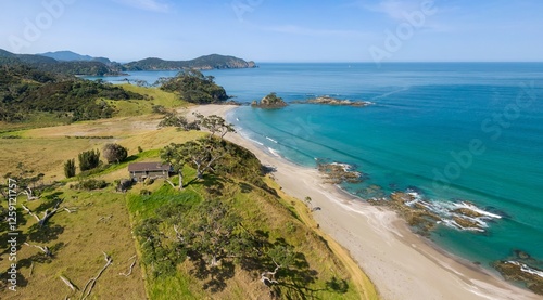Tranquil Elliot Bay beach scene, New Zealand. Coastal home nestled amongst lush greenery. Aerial view. Rawhiti, Northland, New Zealand