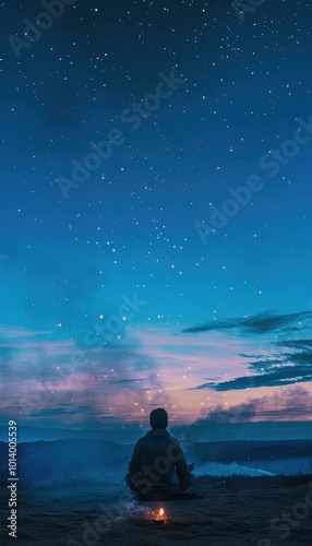 meditation, evening, starry sky, incense burner, tranquil, outdoors, person, cross-legged, smoke, star, serene, calming, relaxation, mindfulness, nature, peaceful, twilight, spiritual, night, atmosphere, contemplation, solitude, vista, horizon, calm, meditative, holistic, wellness, calmness, zen, scenery, cosmic, aethereal, blue