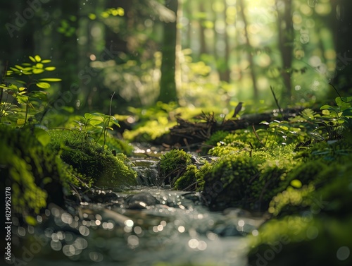 forest, stream, tranquil, sunlight, tree, nature, serene, greenery, moss, water, peaceful, timberland, landscape, environment, scenic, foliage, lush, calm, wilderness, beauty, flow, creek, vegetation, ecosystem, flora, floor, picturesque