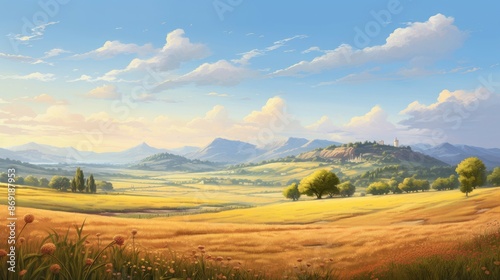 Tranquil golden rolling hills landscape with a distant mountain range. The sky is blue and dotted with fluffy white clouds.