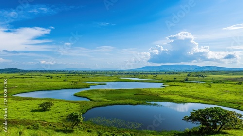 landscape, nature, scenic, water, sky, cloud, horizon, vegetation, wetland, lake, meadow, rural, summer, daytime, green, blue, bright, calm, peaceful, serene, tranquil, unpolluted, pristine, clear, open, wide, huge, extensive, beautiful, vibrant, colourful, natural, environment, ecology, wildlife, habitat, flora, fauna, ecosystem, conservation, preservation, outdoors, travel, adventure, exploration, view, panorama