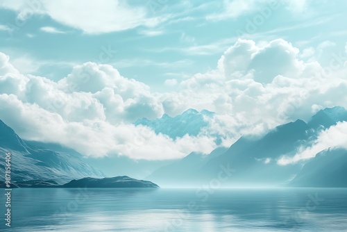 lake, mountain, landscape, sky, cloud, blue, white, puffy, tranquil, serene, calm, peaceful, nature, scenery, view, travel, vacation, wilderness, environment, horizon, water, fresh, clean, beauty, serenity, relaxation, dream, escape, freedom, inspirational, minimalist, simple, abstract, artistic, digital artwork, painting, background, wallpaper, desktop