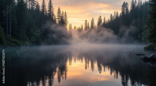 lake, sunrise, mist, reflections, tree, nature, landscape, serene, calm, outdoors, water, scenic, morning, fog, tranquil, forest, east, photo, horizon, beauty, peaceful, silhouette, cloud, magic, light, stillness, wilderness, environment, natural, idylli, blue, orange, green, reflected, vapour, glow, dawn, geography, calmness, serenity