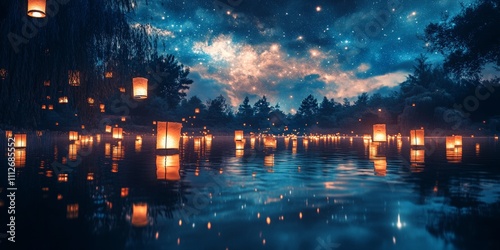 Tranquil Lake Under Starry Sky, a peaceful lake mirroring a galaxy above, illuminated by floating lanterns, evoking calm and wonder