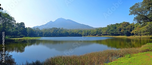 Tranquil Lake with Mountain and Lush Green Vegetation