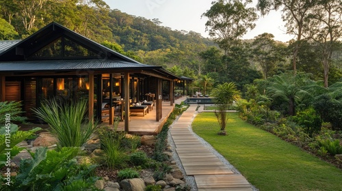 house, villa, luxury, resort, tropical, architecture, modern, building, estate, nature, green, landscaping, garden, path, paseo, tree, plant, vegetation, grass, lawn, pool, water, wood, forest, mountain, hill, deck, balcony, terrace, design, style, peaceful, serene, calm, relaxing, tranquil, oasis, escape, wellness