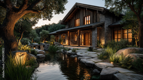 Tranquil Luxury: A captivating architectural masterpiece blends seamlessly with nature, featuring a serene waterside setting and inviting warm lighting.