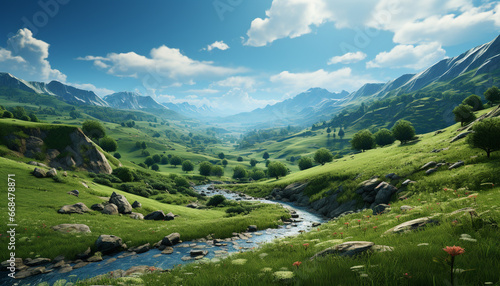 Tranquil meadow, green mountains, blue sky nature panoramic beauty generated by AI