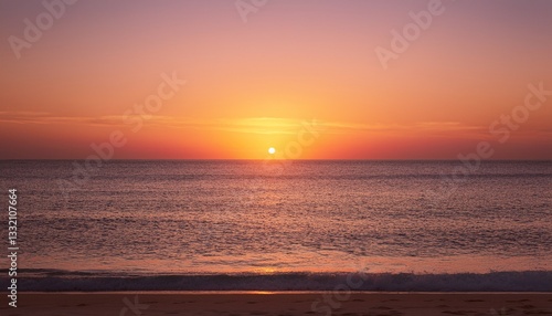 Tranquil minimalist beach sunset scene as the sun dips below the horizon, leaving behind a soft, beautiful gradient of orange and pink in the sky