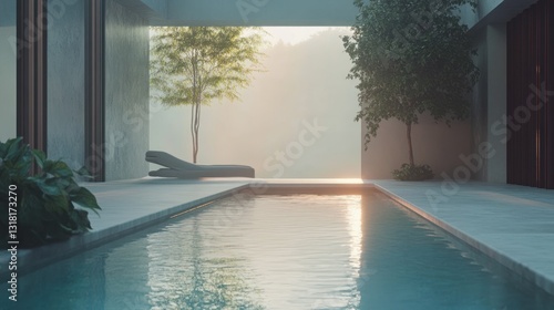 Tranquil modern poolside with sunrise view, minimalist architecture, lush greenery, and lounge chair.