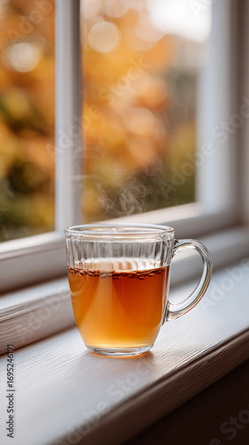 Tranquil morning with steam rising from tea mug on windowsill in autumn