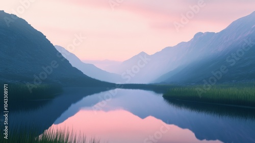 mountain, lake, sunrise, dawn, pink, sky, water, nature, landscape, scenic, beautiful, peaceful, serene, calmness, calm, tranquil, wilderness, outdoors, travel, summer, morning, dusk, evening, cloud, mist, fog, hill, vale, horizon, blue, green, grass, reed, quiet, solitude, serenity, harmony, beauty, natural, panoramic