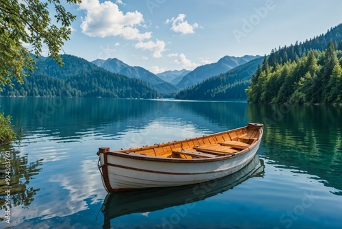 Tranquil mountain lake scene with a wooden boat docked by the shore, surrounded by lush green forests and clear blue sky.