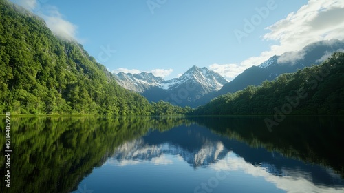 Tranquil Mountain Landscape Reflecting on Still Water with Lush Green Forests and Snow-Capped Peaks