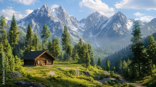 Tranquil mountain scene with a cozy cabin nestled among pine trees and a backdrop of towering peaks.