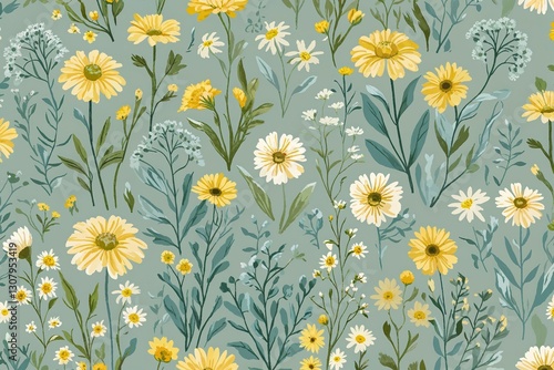 Tranquil Nature-Inspired Fabric Design Featuring Wildflowers in Soft Yellow Seafoam and Cream