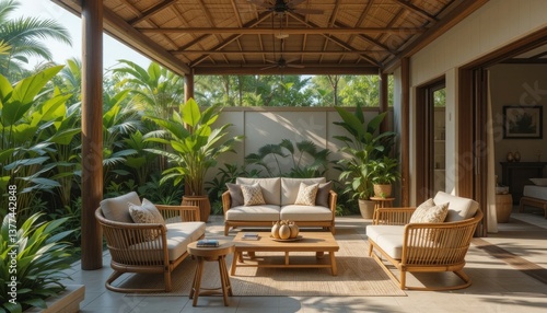 patio, furniture, tropical, relaxation, luxury, resort, villa, garden, design, home decor, summer, vacation, travel, peaceful, serene, calm, tranquil, natural light, warm, cosy, comfortable, rattan, wicker, wood, beige, neutral, green, plant, landscaping, architecture, modern, minimalist, stylish, elegant, sophisticated, roomy, bright, airy, sunlit, backyard, courtyard, stone, paver, roof, thatched roof