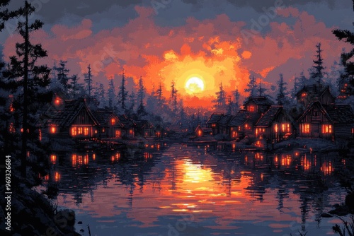 Tranquil Pixelated Village Silhouette at Sunset with Copy Space, Minimalist Design Concept