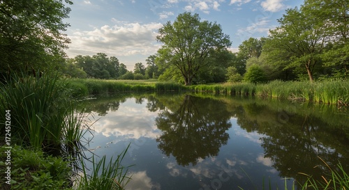 duck pond, water, nature, landscape, tree, vegetation, green, sky, cloud, still, calm, tranquil, peaceful, environment, scenic, beauty, photo, greenery, plant, forest, mirror, stillness, calmness, view, quiet, serenity, reed, flora, image, picture, photo, daylight