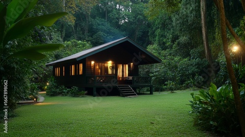 Tranquil retreat cozy cabin in lush jungle nature photography serene environment wide angle eco-friendly concept