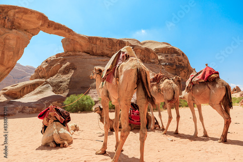 camel, dromedary, desert, jordan, camel, middle east, travel destination, rock formation, sandstone, adventure, nature, arid climate, scenic, calmness, wildlife, heritage, landscape, sand, blue skies, traditional, saddle, famous place, sunny day, warm colors, exploration, red sand, path, attraction, stone bridge, reserve, tour tourism, panorama, arabic, unesco, mammal