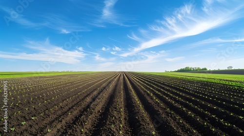 field, agriculture, farm, landscape, green, sky, nature, plant, spring, row, rural, farming, land, crop, countryside, dirtied, summer, farmland, food, earth, blue, agricultural, cultivated, plowed, crop, country, grass, ploughed, plough, ground, meadow, cloud, horizon, outdoors