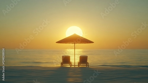 Tranquil Sunset Over Calm Ocean with Beach Chairs and Umbrella