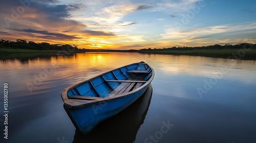 Tranquil sunset scene with a blue wooden boat floating on a calm river reflecting the orange sky : Generative AI