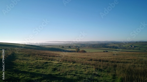 Tranquil view of a countryside with undulating fields and clear blue sky