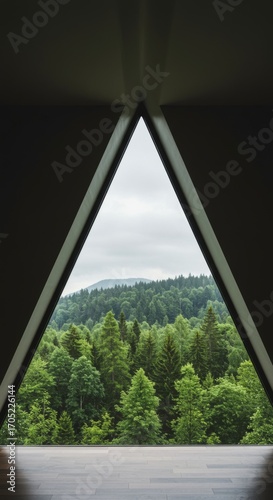 forest, view, modern, window, minimalist, architecture, nature, tree, green, interior, design, calmness, landscape, geometric, serene, scenic, wood, peaceful, frame, contemporary, natural, open, floor, triangular, sky, horizon, wilderness, fresh, environment, lush, vegetation, vibrant, relaxing, picturesque, balance, unique, style, simplicity, calm, perspective, vista, aesthetic, room, daylight