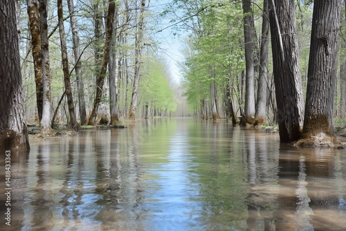 forest, flooded, inundation, water, tree, spring, nature, landscape, calm, serene, tranquil, sunny, environment, riparian, timberland, overflow, stream, flow, mirroring, clear, peaceful, scenic, picturesque, outdoors, day, sunlight, season, fresh, green, lush, vibrant, growth, renewal, change, climate, weather, natural disaster, ecosystem, habitat, conservation, preservation