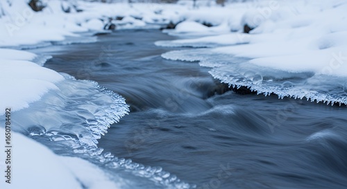 Tranquil Winter Stream with Intricate Ice Formations and Flowing Water