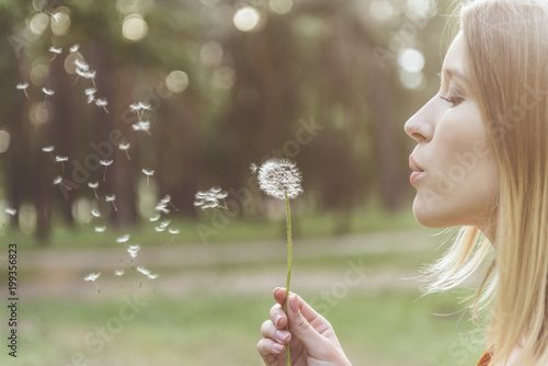 tranquil woman standing in park and blowing on dandelion. Copy space in left side