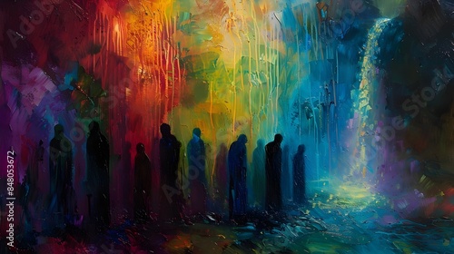 journey, subconscious, consciousness, waterfall, figure, environment, vibrant, palette, impressionistic, oil, painting, hypnotic, dreamlike, surreal, abstract, colourful, cascading, blending, high-coloured, aethereal, mystical, spiritual, psychological, imaginative, digital, art, creative