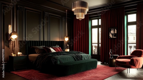 Transform Your Space with a Dramatic Bedroom Poster: Featuring a Black Bed, Emerald Curtains, and Wine-Colored Accents for Striking Home Décor