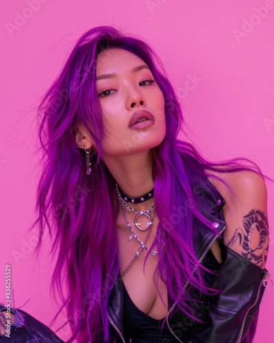 Transgender woman bright purple hair, posing confidently against soft pink studio background